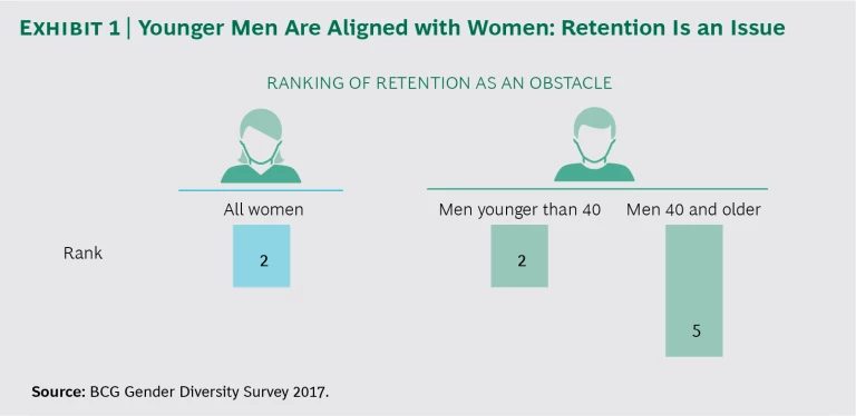 When asked to rank the relative importance of different obstacles, both women and younger men cited retention as the second-biggest factor, whereas older men ranked it fifth of five factors. (See Exhibit 1.) To be clear, however, we should point out that younger men were more in line with older men—and less in sync with women—on some of the other obstacles.