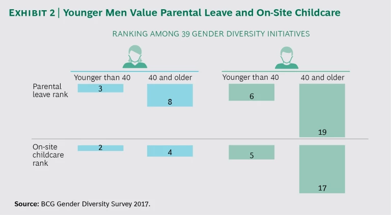 Finally, when we looked at the full list of 39 interventions and asked about the most important, we found that men under 40 were much closer to women in their ranking of the interventions overall than they were to older men. In two areas, men under 40 were the furthest from their older male colleagues: parental leave and on-site childcare. For both interventions, men under 40 rated these much higher than did older men (a difference of ten places in the rankings), and younger men were much more in line with the ratings of women of all ages. (See Exhibit 2.) Notably, fatherhood had little impact: the rankings of childless men younger than 40 were just as similar to women’s rankings as those of their male counterparts who had children.