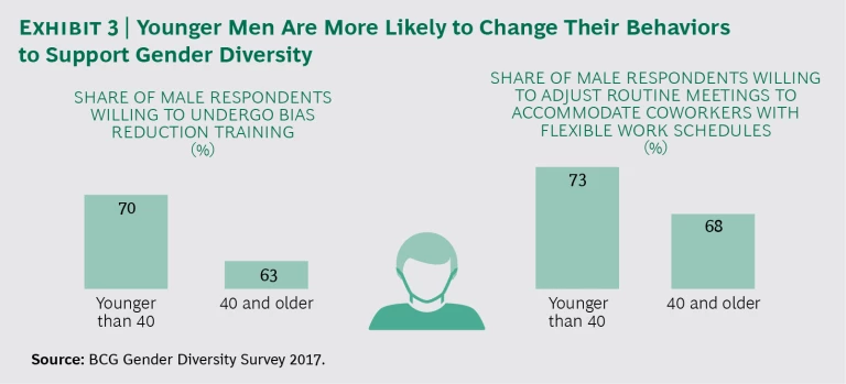The data shows that in addition to being closer than older men to women in their ranking of the interventions, younger men are more likely to change their behavior to make the interventions succeed. Specifically, a higher percentage of men under 40 said that they would take steps to support flexible work, such as changing the schedule for routine meetings, redistributing work across a team, and tracking performance on the basis of outcomes rather than hours worked. Additionally, younger men indicated that they are more willing to hire candidates from nontraditional recruiting pools and to undergo bias reduction training in order to improve gender diversity. (See Exhibit 3.)