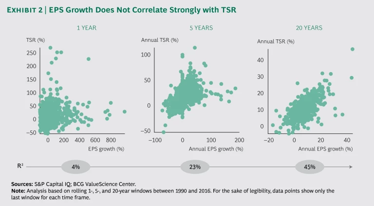 Third, they avoid using simplistic proxies for TSR success, such as managing quarterly or annual EPS growth, which in fact do not correlate strongly with TSR, even over longer time frames, and can be subject to manipulation or gaming. (See Exhibit 2 and the sidebar, “The Rules of Best-Practice TSR Management.”)