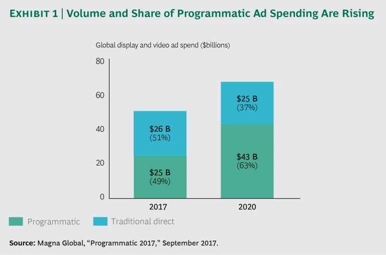 Automation and digital technologies are bringing big leaps in effectiveness and efficiency to many industries by extending reach, speeding up interactions, streamlining processes, and replacing manual and paper-based activities. As more and more advertising spending has moved online in recent years, automated, or programmatic, processing of ad sales and campaign execution has built significant share of the digital market. Around the world, this trend shows no signs of slowing. Programmatic spending hit $25 billion in 2017 and is projected to exceed $43 billion by 2020, when programmatic penetration of the digital ad market will be 63%. (See Exhibit 1.)