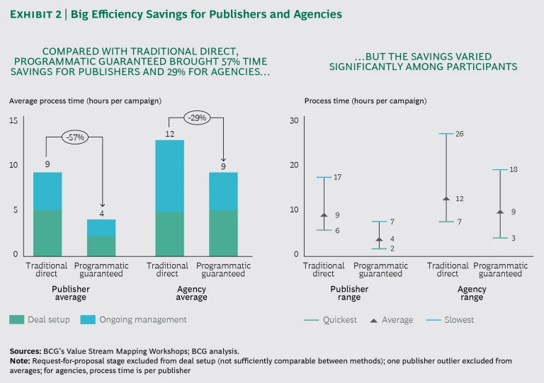 One fast-rising driver of this growth is commonly known as “programmatic guaranteed.” It effectively replaces the manual execution processes involved in the premium inventory segment that is regularly used by brand campaigns. As with other programmatic processes, programmatic guaranteed is both more efficient and more effective than manual approaches. In fact, our recent research found that the programmatic guaranteed process, compared with traditional tag-based reservations, was more than 50% more efficient in terms of time saved for the publishers and almost 30% more efficient for the agencies. (See Exhibit 2 and the sidebar.) Advertisers, agencies, and publishers that are ahead of the curve are realizing big benefits, but full implementation of programmatic guaranteed requires a rethinking of the organization and its operations and systems.