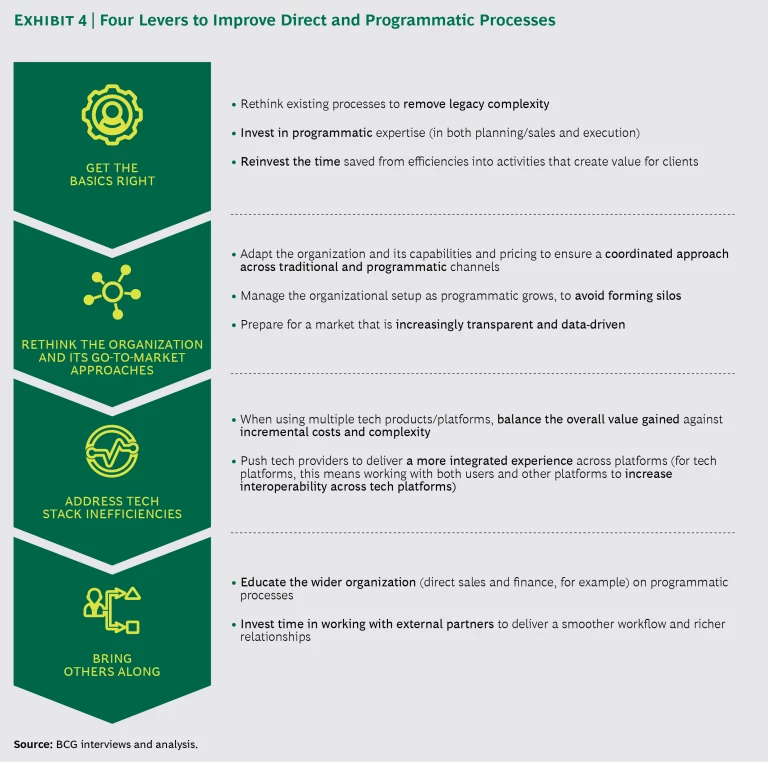 The benefits of programmatic guaranteed to both publishers and agencies (and to agencies’ advertiser clients) are large enough that we expect this technique’s replacement of traditional reservations and other forms of programmatic to accelerate. We see four things that agencies and publishers can do to position themselves to take advantage. (See Exhibit 4.)