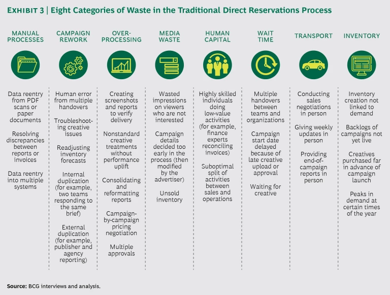 Our study unearthed a number of pain points in the traditional reservation process, many of which are common in the negotiation, setup, and delivery of digital advertising campaigns (as well as in other business processes). (See Exhibit 3.) These inefficiencies result in significant levels of operational waste—and therefore in value left on the table—for advertisers, agencies, and publishers. Three primary sources of operational waste are manual processes, campaign reworking, and overprocessing. We also found significant levels of media waste—various combinations of the wrong ads, unintended viewers, and poor timing.