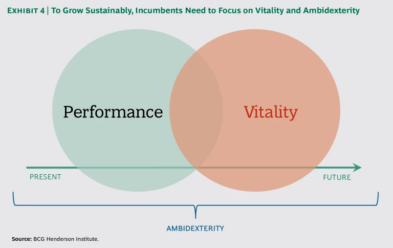 Vitality alone is not enough for incumbents to thrive and grow sustainably. Overperformance within the core business is also necessary in order to finance vitality. Even if having deeper pockets is a potential advantage for incumbents, they must still work at realizing ambidexterity—being able to run and reinvent the company at the same time. (See Exhibit 4.)