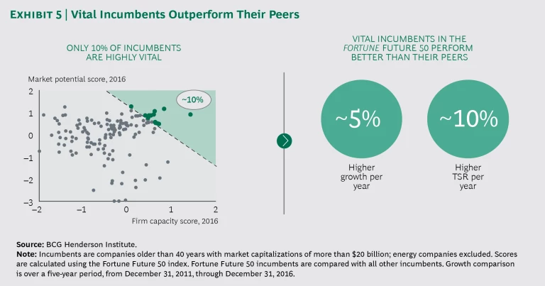 Building vitality is essential for established companies that want to survive and thrive. Even when measuring short-term health, vital companies are in the lead. From 2011 through 2016, the top-10% most vital incumbents in the Fortune Future 50 outperformed their peers by 5% per year in growth and 10% per year in TSR. (See Exhibit 5.)