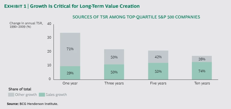 The challenge is straightforward: growth is critical for sustained value creation. In the short term, companies can create value by optimizing costs or assets or by building investors’ expectations. Yet in the long run, most value creation comes from top-line growth, which accounts for 74% of total shareholder return of S&P 500 top-quartile-performing companies over a ten-year period. (See Exhibit 1.)