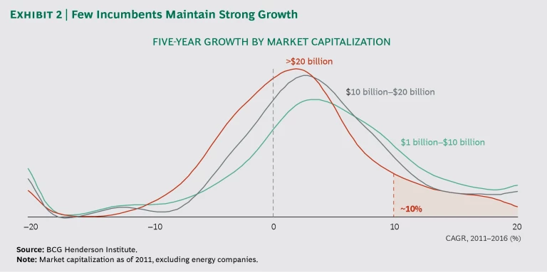 The good news is that achieving sustainable growth is still possible for today’s incumbents. Approximately 10% of large US companies are growing at double-digit rates. (See Exhibit 2.) Among that 10%, many—such as Visa and Mastercard (credit cards), Hilton (hotels), Constellation Brands (alcoholic beverages), and O'Reilly (auto parts)—are from nontech industries. What is their secret?
