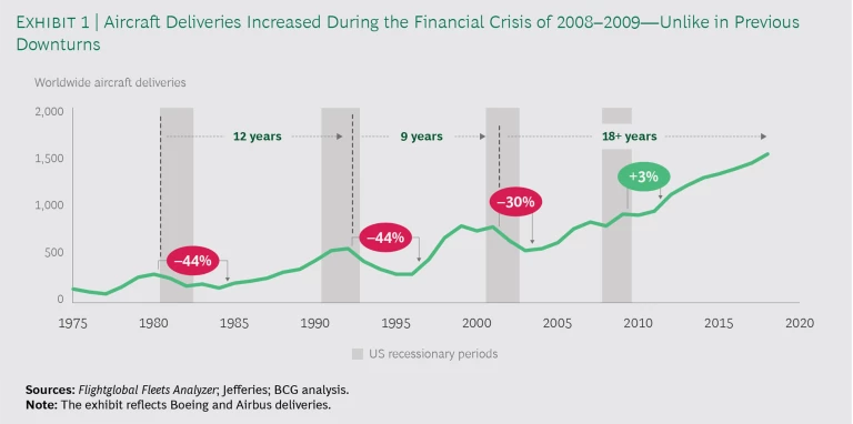 For the most part, our analysis yielded good news. The current expansion—an 18-year (and counting) supercycle of growth in commercial aircraft deliveries—is unprecedented in modern aviation history. The last major industry downturn was in the early years of this century following the dot-com bust and 9/11. Boeing’s and Airbus’s combined order backlog currently sits at approximately 14,000 units, higher than ever before, and represents nearly eight years of production, which is also very high by historical standards. Airlines’ revenue per passenger kilometers (RPK), a metric that is strongly correlated with aircraft orders, is forecast to grow from 4.5% to 6% a year for the next two decades as demand for air travel continues to grow worldwide. Both Boeing and Airbus have a healthy mix of exposure worldwide that insulates them from the impact of an outlier event in any one market. As Exhibit 1 shows, not even the 2008–2009 financial crisis was enough to stop the current expansion. (The recent grounding and subsequent production slowdown of the Boeing 737 MAX don’t represent a long-term, systemic issue for the industry.)