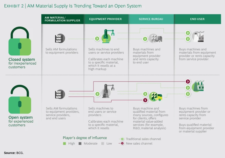 In light of these developments, we expect users to increasingly demand an open system in which they can purchase materials qualified for specific equipment directly from their preferred material suppliers. (See Exhibit 2.) The trend toward an open system is already evident for equipment that uses metal-based AM processes. Closed systems still predominate in polymer-based processes, where equipment providers are, to some extent, responsible for material formulation. As AM processes become more widely adopted for higher-volume industrial production, open systems will likely come to prevail throughout the industry. The shift toward open systems poses a threat to those equipment providers whose profitability depends on selling materials.