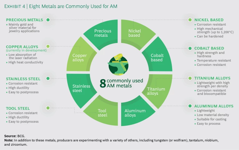 The landscape for metal powders is also diverse. (See Exhibit 4.) Commonly used alloys are based on nickel, cobalt, titanium, or aluminum. Nickel-based alloys (such as Inconel) are corrosion resistant, have high mechanical strength, and can be hardened. Cobalt-based alloys are strong and hard and resistant to high temperatures and corrosion. Titanium alloys are lightweight, strong per density, corrosion resistant, and biocompatible. Aluminum alloys, used for casting, have low material density and are lightweight and easy to process. Tool steel and stainless steel powders are also used. Both are corrosion resistant and well suited to high-ductility postprocessing. Copper alloys (currently in development) and precious metals (mainly gold and silver) are used only in small volumes for niche applications.