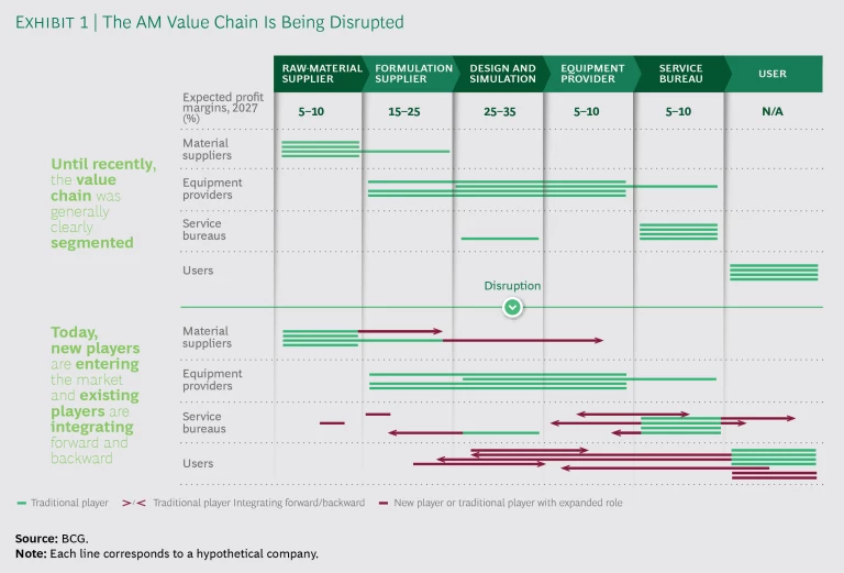 Equipment providers have traditionally dominated most aspects of the AM value chain. In addition to manufacturing printers, some equipment providers have used raw materials supplied by chemical manufacturers to formulate materials used in AM processes. They have also designed and simulated products. In some cases, equipment providers have operated as service bureaus by printing products for end users. Today, other players are disrupting the AM ecosystem by asserting themselves more strongly in their traditional roles and expanding into new roles—especially those with the highest margins. (See Exhibit 1.)