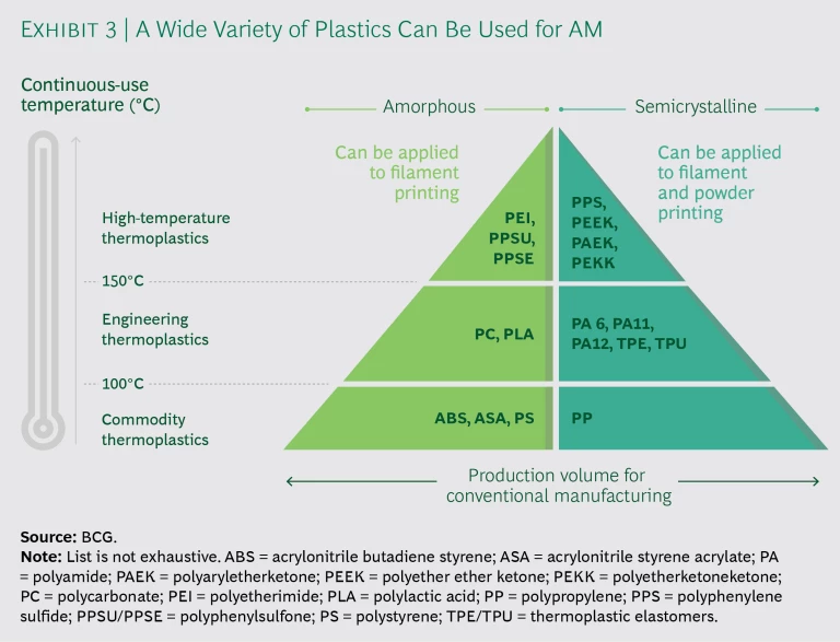 Expanding the Range of Materials Offered. To enable end users to utilize AM on an industrialized basis, suppliers must offer a wider range of printable polymers and metal alloys. These materials need to not only match the requirements of specific target industries but also be tailored to the specific needs of applications and customers. Indeed, experienced users are demanding formulations that are individually developed and produced for their specific applications. It is also essential to provide consistently high quality and reliable delivery of materials at the required volume.
