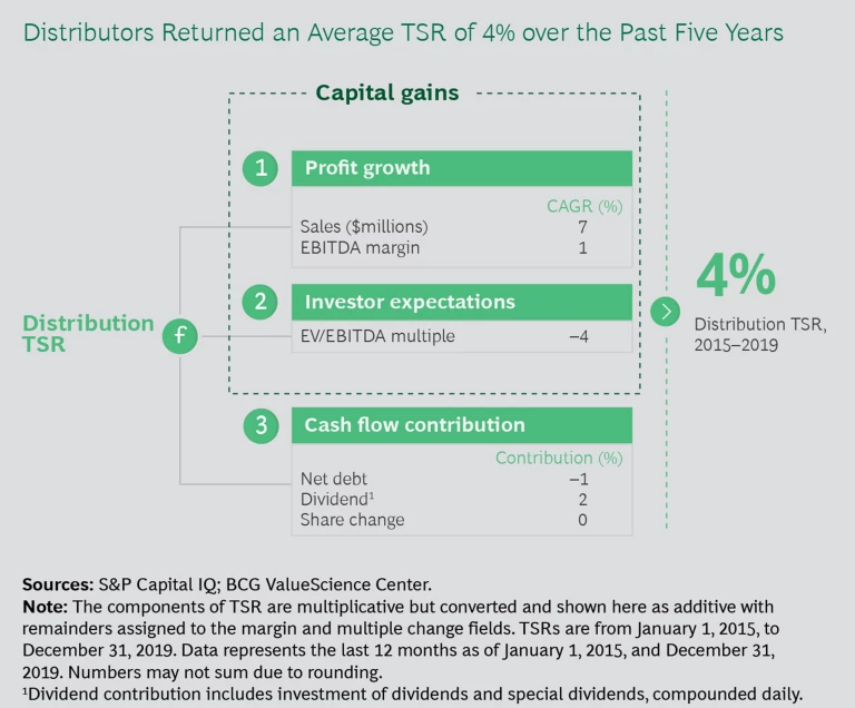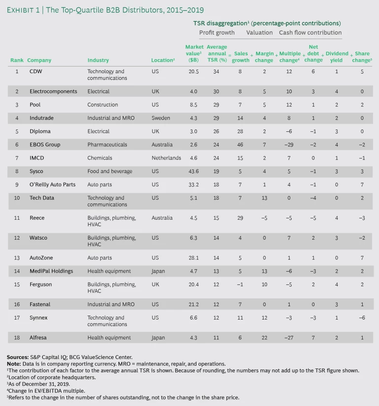 But a subset of companies found ways to boost TSR by double digits despite these challenges. Top-quartile distributors delivered median returns of 18% from 2015 to 2019—nearly five times higher than the average player. (See Exhibit 1.)