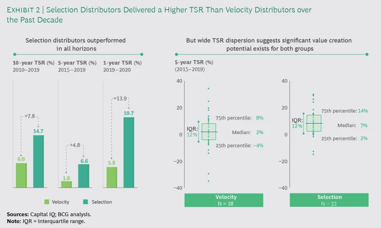 Both business models generate shareholder value, but over the past decade, selection distributors have generated more of it—and have done so more consistently. (See Exhibit 2.)