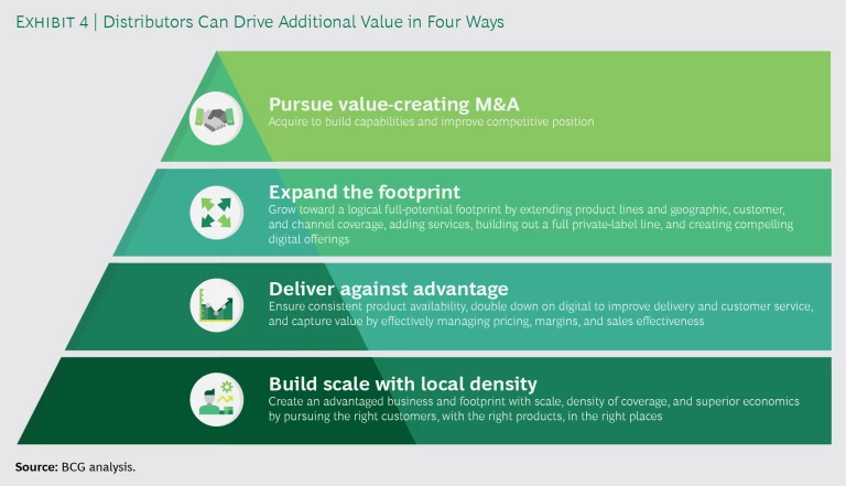 How do distributors create that advantage? Instead of doing everything at once, top B2B distributors do the right things in the right order, sequencing their investments in a way that creates and cements clear sources of advantage before expanding in a measured way. That hierarchy has four ways to drive value. (See Exhibit 4.)