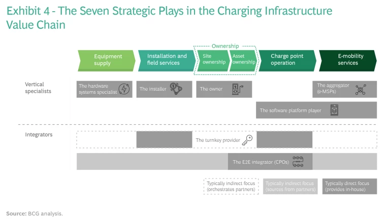 CPOs must also carefully assess current and future demand and determine charge-point capacity. To attract and keep customers, and remain attractive to end users, they need to create differentiated end-to-end offerings that feature sophisticated software along with a reliable field force for maintenance and repair service. Those interested in ownership need deep pockets or well-capitalized partners to fund them. The best bets for CPOs will be the owner, E2E integrator, and turnkey provider plays.