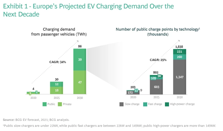 It may not have the same allure as bringing the latest battery-powered concept car to life. But public charging represents an explosive market opportunity for participants in the rapidly evolving electric vehicle ecosystem. Sales of electric vehicles, including plug-in hybrids, were virtually untouched by the COVID-19 pandemic—and they are on track to account for one out of every two new cars sold in Europe by 2030, according to BCG estimates. As sales of EVs grow, energy demand will increase exponentially.
