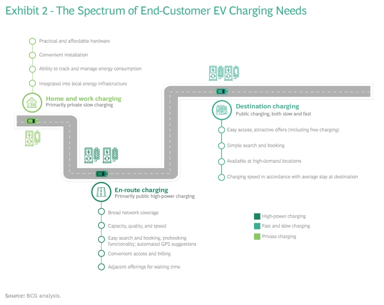 The charging environment is still very new. But as sales of electric vehicles rise and battery ranges increase, customers will develop a broad range of needs—from private charging at home and at work to public charging while traveling and at destinations. And these needs must be addressed as seamlessly as those related to gas-powered vehicle travel currently are. (See Exhibit 2.)