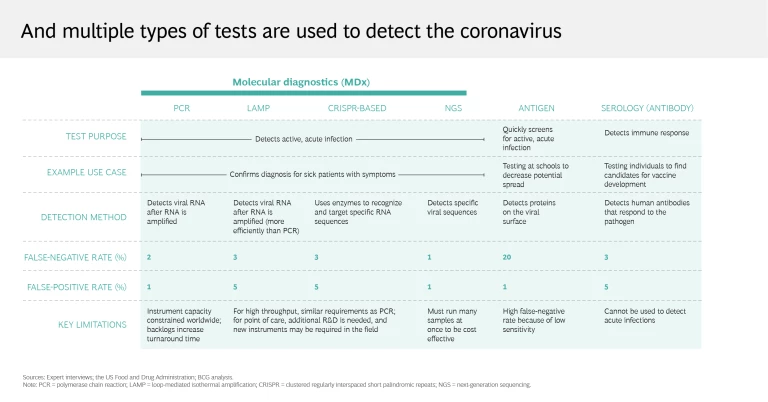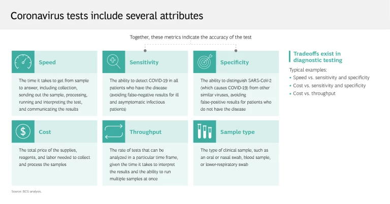 There’s a lot more to testing than deciding whether to use a nasal or throat swab. Coronavirus test attributes include speed, sensitivity, specificity, cost, throughput, and sample type—and different testing modalities are best suited for certain use cases. For example, the molecular polymerase chain reaction (PCR) test, considered the gold standard, is highly sensitive and specific, making it ideal for diagnosis and triage. But it takes time to process the test, which requires laboratory analysis, so PCR is less effective in population health surveillance. Conversely, the speed with which the rapid antigen test can deliver results makes it the test of choice for identifying the prevalence of the coronavirus in a given region, even though the test is more likely to produce a false negative.