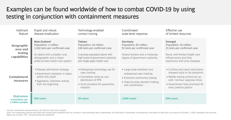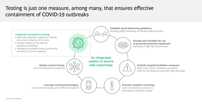 As these limitations show, testing alone clearly isn’t enough to put an end to the pandemic. Regions and health systems that have largely crushed and contained the virus know that for testing to be effective, it must be carried out aggressively and supplemented with an integrated mitigation system. Social distancing, tech-enabled contact tracing, and the broad distribution of personal protective equipment are critical to this effort, as are targeted lockdown measures. Organizations must implement symptom screening and promote self-reporting to ensure employee safety and operational continuity.