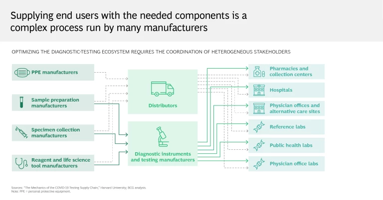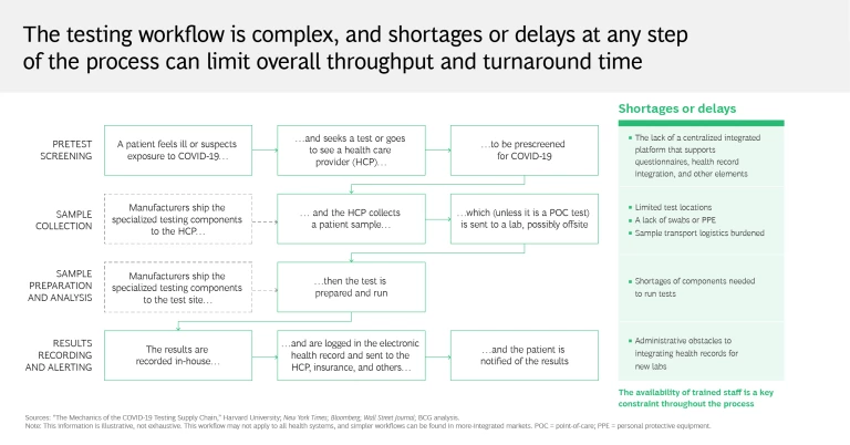 A testing workflow is a highly complex process that requires coordination among many stakeholders—hospitals, pharmacies, equipment distributors, life sciences companies, and laboratories among them. Shortages or delays at any step can limit throughput and turnaround time, which in the current global context of strained supply chains, inconsistent testing practices, and a stretched-thin medical community has proved a challenge for many governments and health care systems. Testing centers depend on swabs and personal protective equipment, just as labs rely on critical components for determining the presence of the virus. Trained staff are needed across the entire process, from sample collection to results reporting.