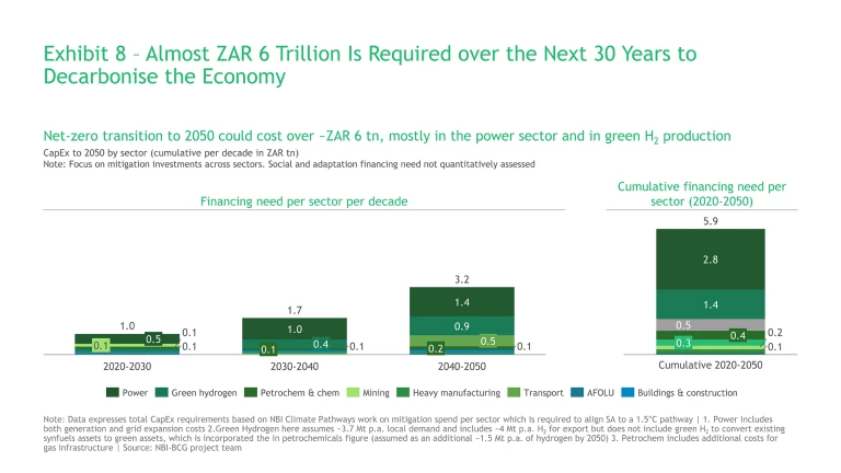 - More than ZAR 6 trillion in investments is needed to reach a net-zero South Africa by 2050. Of this, the power sector requires nearly half of the required investments (about ZAR 3 trillion).
