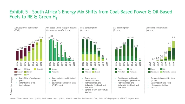- A net-zero South Africa will have renewable power as the primary energy carrier; fossil fuels will be phased out. Gas will be used in limited volumes and for a short period in the transition (to enable a larger and faster scale-up of renewables and the competitive decarbonization of other sectors) and will be phased out as soon as cost parity with green alternatives is reached.