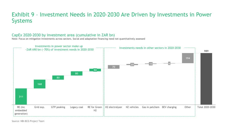 - Approximately ZAR 1 trillion is required by 2030, of which ZAR 310 billion is required for investments in renewable energy alone. Overall, about 60% of the investments needed by 2030 are sufficiently bankable and mature enough to be funded mainly from private-sector sources.