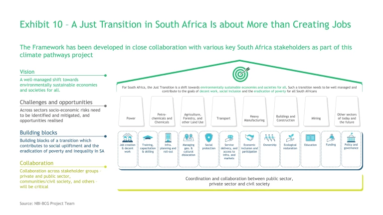 The Climate Pathways and Just Transition study (conducted by the National Business Initiative, Business Unity South Africa, and BCG) assesses what it would take to achieve a net-zero South Africa by 2050 and to ensure a just transition, which aims to move South Africa to a net-zero economy that is socially resilient and inclusive. The study is to date one of the most robust, transparent, and inclusive examinations of climate change in South Africa.