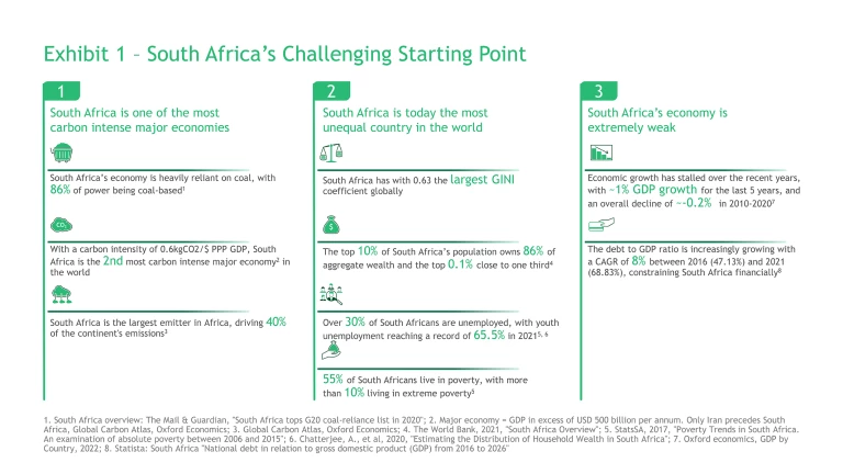 - A net-zero South Africa is one of the most challenging decarbonization undertakings globally, given South Africa’s heavy reliance on coal; its triple challenge of inequality, poverty, and unemployment; and its weak economy.