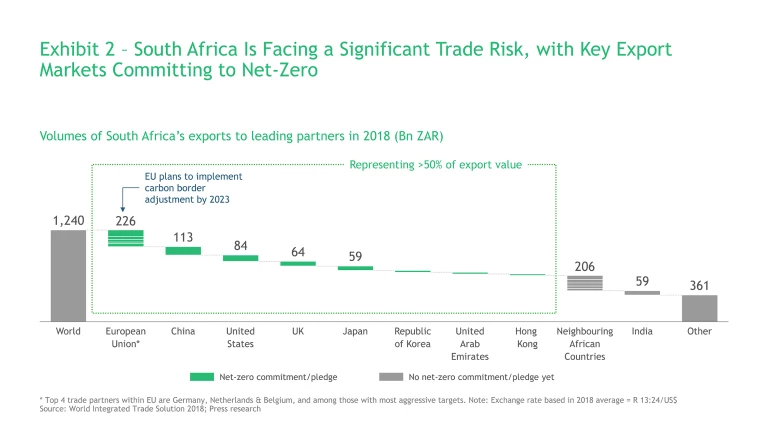 - The economic and social cost of inaction is massive. Approximately 50% of South Africa’s export value, more than 1,000,000 direct jobs, and some 15% of GDP will be at risk if carbon emissions in South Africa are not reduced.