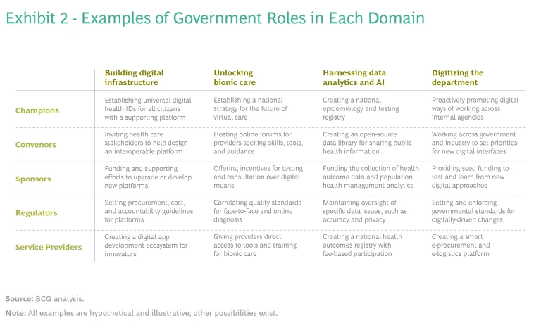 You don’t have to play the same role in each domain. The same government can act as a Regulator of virtual care (unlocking bionic care delivery), as a Service Provider of electronic health records (building digital infrastructure), and as a Champion of agile innovation processes (digitizing the department). Aim for a combination of roles that will lead to success.