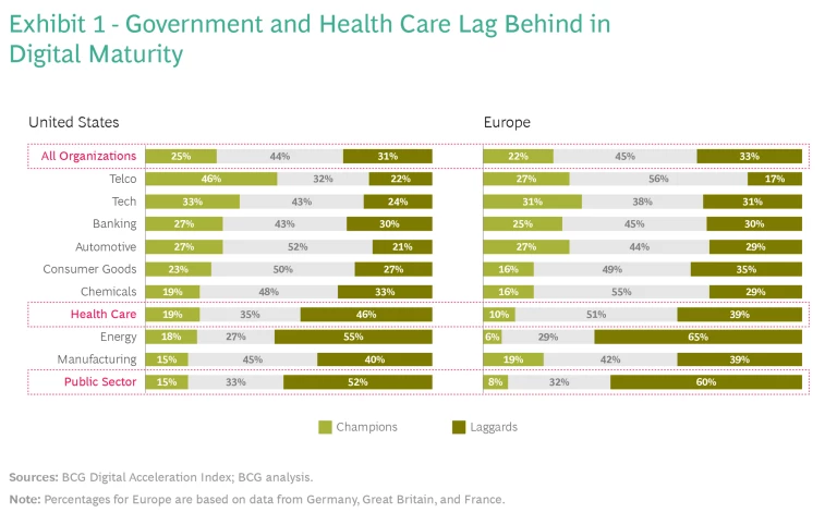The digital maturity of health care and public sector organizations, as shown in Exhibit 1, tends to lag behind other sectors. This finding comes from BCG’s Digital Acceleration Index, based on annual surveys of senior executives at 11,000 companies. The lower relative scores show how challenging the task is for health care and government, but also how compelling the opportunity. If the health care industry can catch up with its counterparts in, say, consumer products or finance, then it could unlock enormous amounts of value and achieve great gains in quality of care and patient safety.