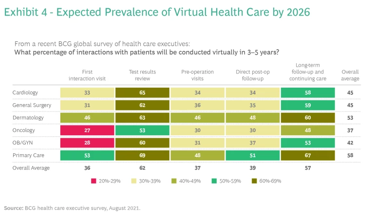 The Organization for Economic Co-operation and Development (OECD), in reviewing studies of virtual care, concluded that telemedicine consistently enables improved coordination, more streamlined management, and reduced fraud and overclaiming. Perhaps that’s why the public appetite for this service continues to grow. Exhibit 4 shows expected growth through 2026, when close to half of all health care interactions are expected to take place virtually.