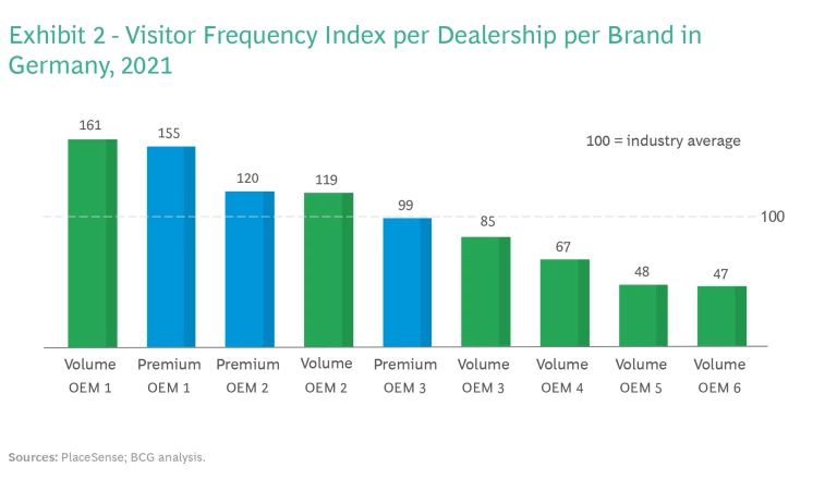 BCG and PlaceSense, an Israel-based data provider, collected and analyzed the footfall data for the major automotive brands in Germany, in 2019, 2020, and 2021.
