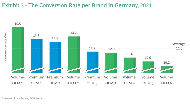 As the exhibits demonstrate, the three OEMs that had the fewest visitors per dealer also had the lowest conversion rates. But this doesn’t necessarily mean their sales performance is subpar. In this case, the three OEMs with the fewest visitors have some of the biggest store networks and are relying on a large market presence rather than a strong sales conversion rate.