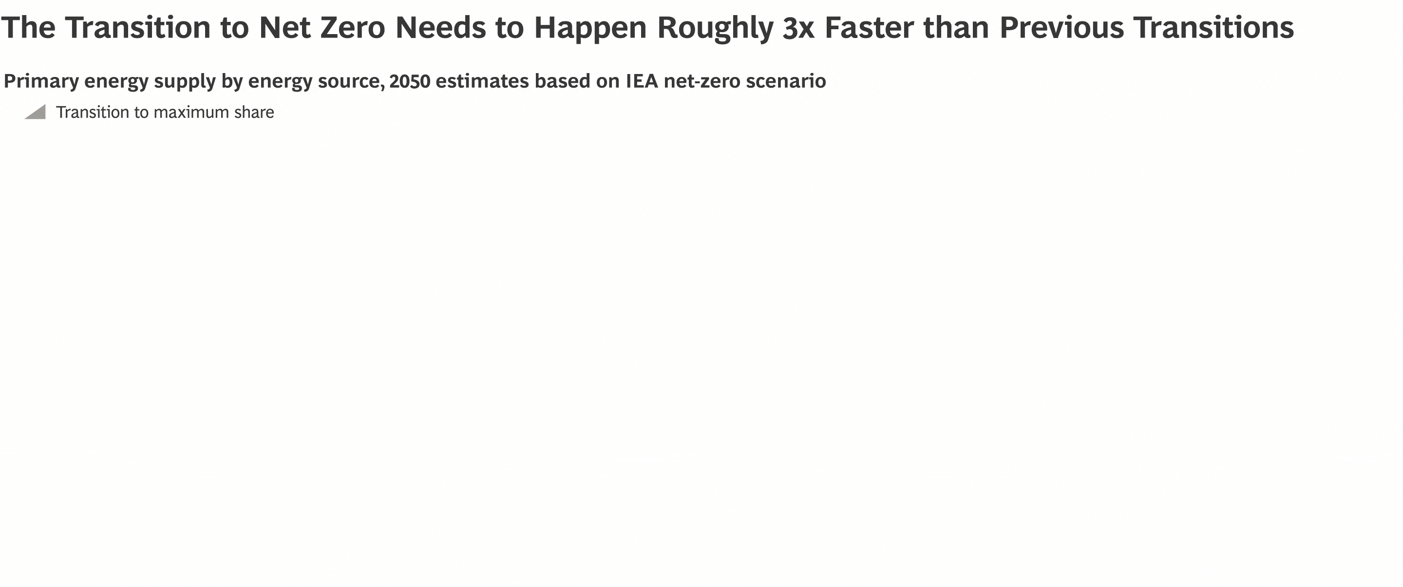 Society has gone through energy transitions in the past—but nothing like this one. The adoption of coal occurred over roughly five decades and the shift from coal to oil took more than three decades. To limit global warming to 1.5°C above preindustrial levels, we must ramp up renewables and other low-carbon solutions at warp speed. These energy sources must match the maximum shares held by coal (55%) and oil (41%) roughly three times faster than those commodities did and ultimately account for most primary energy by 2050—up to 70% in IEA’s Net Zero Emissions scenario. This rapid transition remains a massive challenge and appears increasingly unlikely: current policies would permit warming to +2.7°C by 2100. And the speed of the energy transition in sectors such as industrial manufacturing and buildings is woefully insufficient.