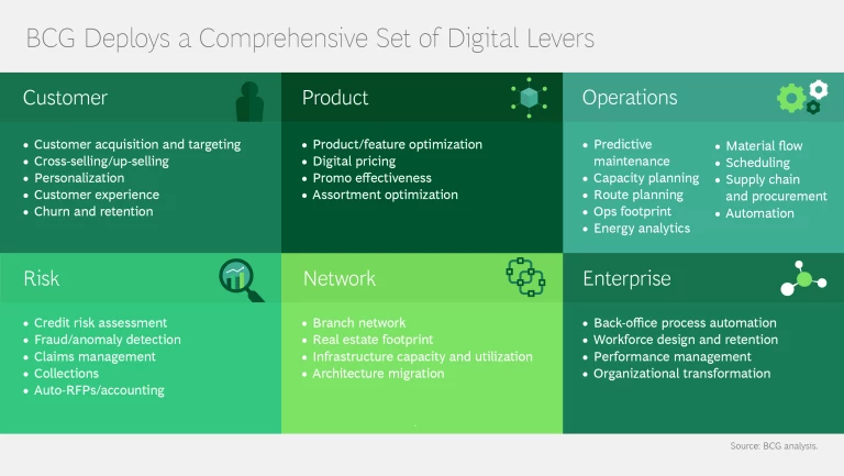 Through our work with clients, BCG has developed a library of typical digital levers, spanning functional areas, that can be quickly assessed for their applicability, then implemented, based on the specific context of the company and its industry.