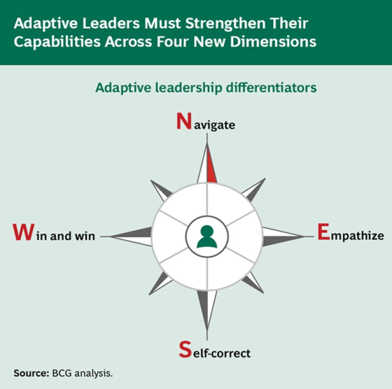 There are four dimensions to leadership that distinguish the adaptive leadership model from more traditional leadership models: navigating a new environment; leading with empathy; learning through self-correction, and creating win-win solutions. (“New Leadership Rules” BCG White Paper, May 2010.)