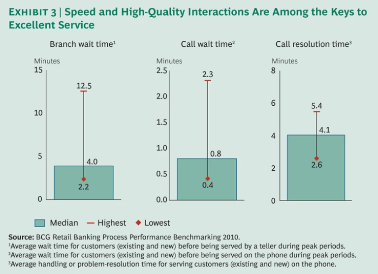 Service Effectiveness. All-star banks design and deliver the highest possible level of service, achieving a high proportion of “first time right” client interactions within and across channels. In our survey, the average branch-wait time at the best banks is just over two minutes, while the average call-wait time is under half a minute and the average call-resolution time is well below three minutes. Expedient, high-quality interactions are the differentiator for top performers. (See Exhibit 3.) All-star banks also assess targets and performance levels holistically. For example, a relatively high call-resolution time could result from a large volume of calls that involve complex problems—with simpler calls effectively handled by interactive voice-response systems and better filtering.