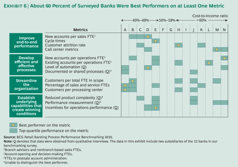 The banking industry’s recent focus on managing out of the crisis proves that cost reduction alone is not enough. Succeeding in the new environment clearly requires excellence in process and productivity. Many banks have made some of the levers discussed above a high priority, pushing them to the top of their management agendas. Our benchmarking results reveal that roughly 60 percent of the banks we surveyed are best performers on at least one of the principal metrics, and all but three demonstrate top-quartile performance in at least one metric. (See Exhibit 6.) None, however, has achieved what we would call full-fledged all-star status, with stellar performances across all metrics. This means that further efforts lie ahead for all banks.