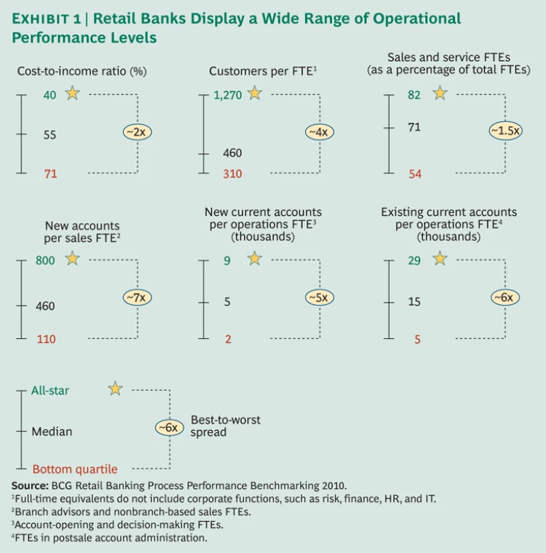 Our benchmarking identified top performers along a number of key metrics. It also revealed a wide range of operational performance among retail banks. (See Exhibit 1.) For example, cost-to-income ratios ranged from 40 percent to more than 70 percent, and customers per full-time equivalent (FTE) ranged from 310 all the way up to 1,270.
