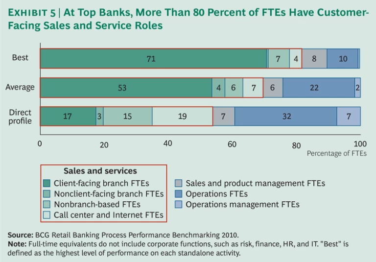 All-star banks invest in achieving leaner overhead, reducing organizational complexity, and maximizing the percentage of FTEs in customer-facing sales and service roles. At the best-performing banks in our survey, more than 80 percent of FTEs had such roles. (See Exhibit 5.) Of course, any streamlining program must also involve initiatives to centralize processing activities and to outsource selected activities when there are clear benefits to doing so.