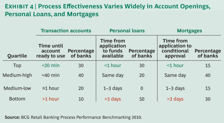 Among our benchmarking participants, we observed wide dispersion in process effectiveness for account openings, personal loans, and mortgages. (See Exhibit 4.)