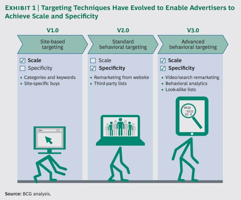 Until recently, advertisers faced a trade-off. Site-based targeting provided campaigns with scale but struggled with delivering relevance on a consistent basis. Standard behavioral targeting could deliver relevance but did not always provide adequate scale. Within the last year or so, some advertisers and their agencies have been employing more data-driven advanced behavioral techniques, in combination with existing techniques, to achieve the best of all worlds: to reach a large-scale, engaged audience with the right message in a cost-effective manner. (See Exhibit 1.)
