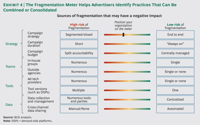 Root out the causes of fragmentation. Select a typical digital campaign and map out all the various internal and external people, teams, agencies, and tools involved. This will show where companies sit on the “fragmentation meter” and let ad- vertisers identify practices that can be combined or consolidated. (See Exhibit 4.)