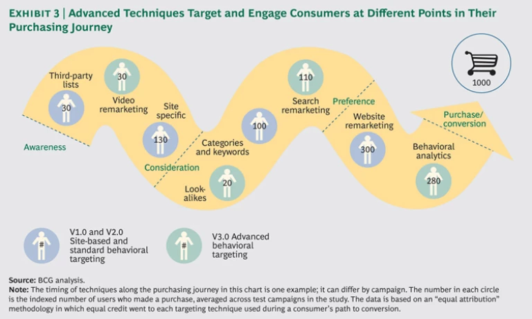 The “freshness” and “completeness” of data available for campaign targeting and optimization is critical to the performance we achieved. Advertisers with a data strategy that ensures data is available in real time (for example, right after a consumer has clicked on a search ad)—and not lost across channels—will have a significant advantage over those that do not. They can target consumers at specific stages of the purchasing journey in ways that those using standard techniques cannot—leading to a higher level of conversions. (See Exhibit 3.)
