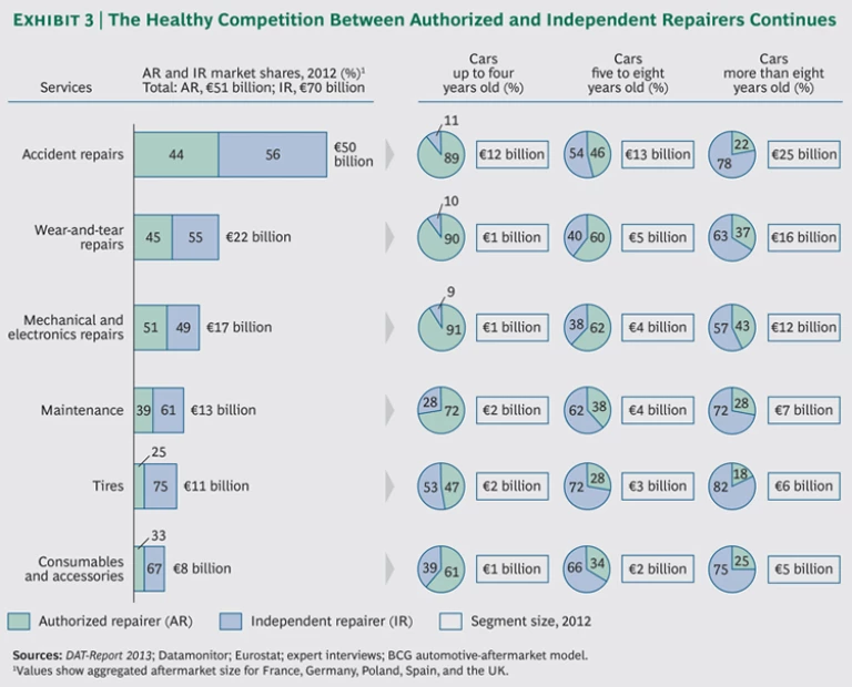 The size of the aftermarket for cars more than eight years old grew the most since 2010, to roughly €71 billion, as drivers held on to their old cars longer. At the same time, the aftermarket for new cars and those up to four years old shrank slightly, to about €19 billion. These two factors combined to shift a few points of market share from authorized repair shops to independent service providers since 2010.