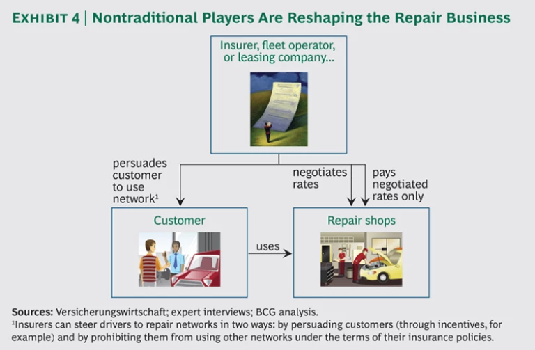 Nontraditional players in the automotive-services market are altering the competitive landscape. (See Exhibit 4.) Insurers, fleet operators, and leasing companies are all experiencing price pressures in their own markets and straining to capture every possible cost advantage. Because vehicle repair and maintenance are among the highest expenses of these nontraditional players, they are moving more and more toward special-condition contracts or partnerships with networks of selected repair shops. Special-condition contracts are not only controlling costs for nontraditional players but also increasing the business volume of their repair-shop partners.